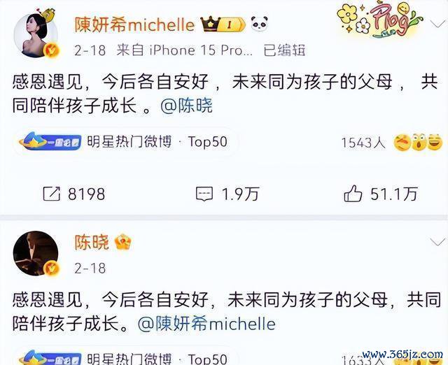 参考贵府——澎湃新闻:陈晓、陈妍希晓谕仳离,将共同随同孩子成长