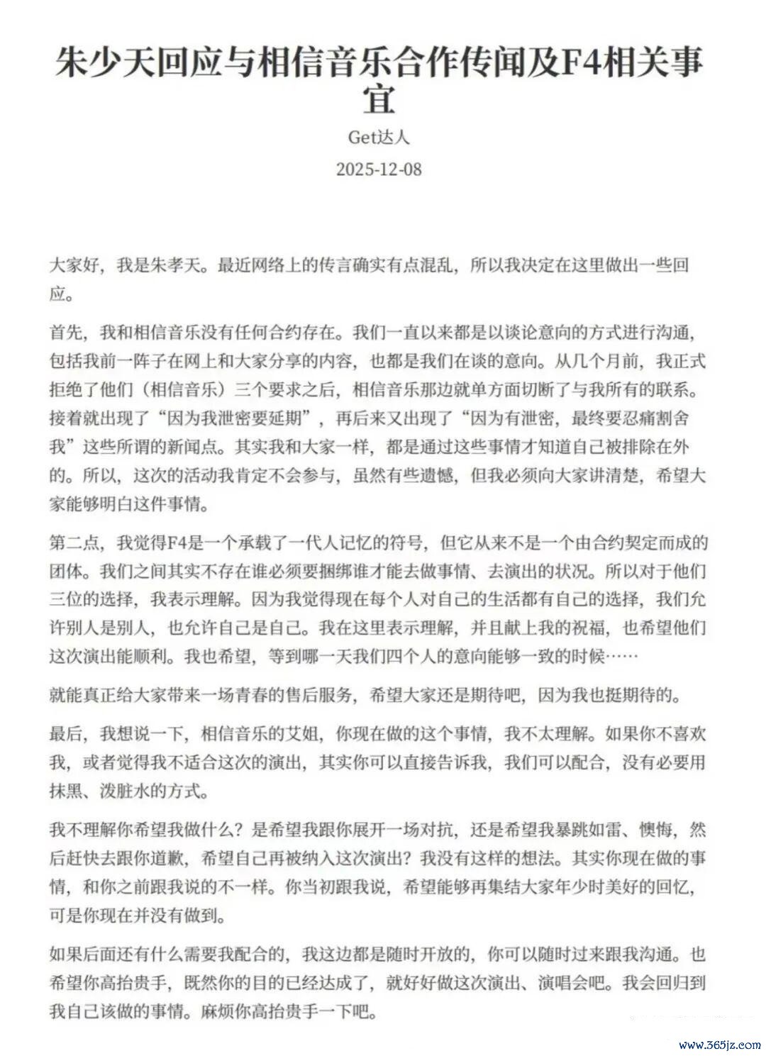 朱孝天更披露几个月前他远离了“深信音乐”的3个条目后,“深信音乐”就片面切除了和他的通盘谈判,随后就出现了因为他泄密演唱会要脱期的说法。
